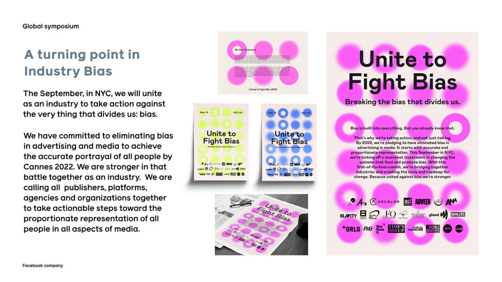 A diversity and inclusion strategy presentation developed to support both internal alignment and external industry impact. The deck communicates key initiatives, messaging, and calls to action through a balance of editorial layout, bold typography, and campaign-driven visuals. Designed to inform, unify, and inspire action around eliminating bias within media and advertising.